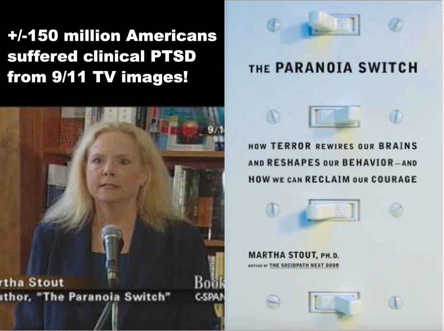 Martha Stout, who is one of our leading experts on psychopathy, which is a very important topic when we study the power elite and how they operate, has cited clinical research showing that about half, a little under half, of the American population, which adds up to close to 150 million people, suffered from clinical PTSD (post-traumatic stress disorder) simply as a result of the TV images that they watched on 9/11. Clinical PTSD! Normally, to get clinical PTSD, you have to have been killing people in the trenches. You have to wash your blood, your buddies head blown off. You know, you had to have been through some pretty intense, nasty stuff in wartime to get PTSD. But half the American population got it from watching TV images. What does that mean? Well, that means that this was the most psychologically significant single event in the entire history of humanity, with the possible exception of the alleged crucifixion of Jesus. And I say alleged crucifixion of Jesus, because according to Muslim scholarly disputes, there's one camp that claims that according to the Koran, maybe Jesus wasn't really crucified. And there's another camp that says well, no, he probably was, but that's not the point. The point is his teachings. The point is to try to be like Jesus, not to get all freaked out about his crucifixion, whatever the truth of that may be.