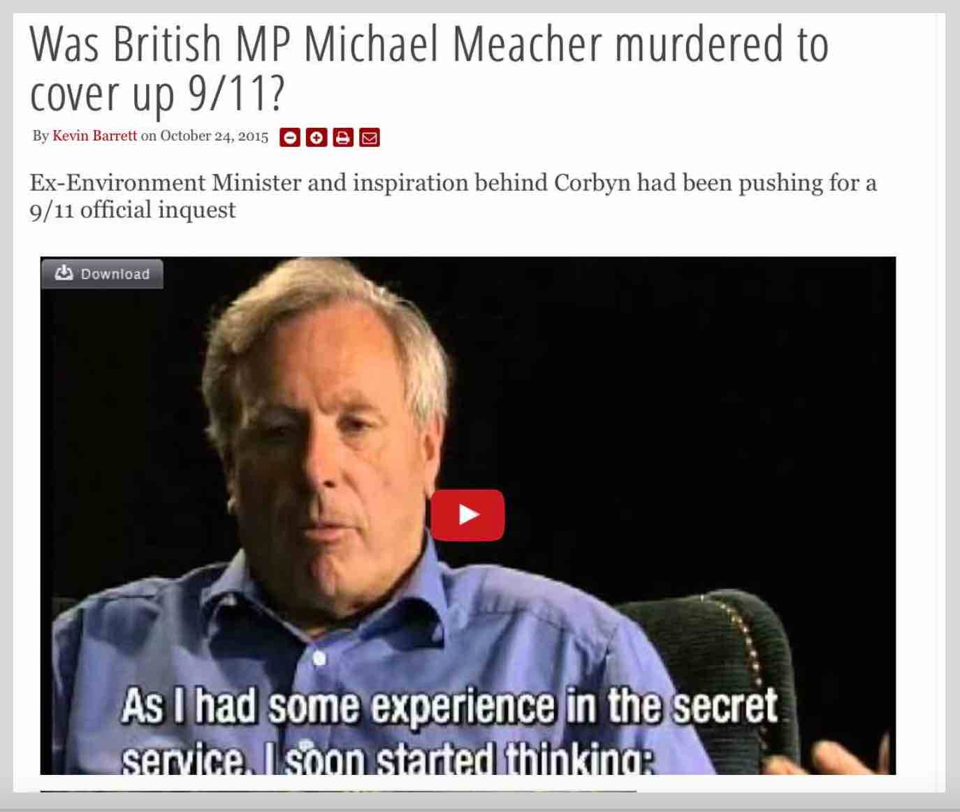 Then there's Michael Meacher, the former environmental minister in the UK. He's very, very close to the current head of the Labour Party, Jeremy Corbyn (then in line to become Prime Minister). And Jeremy Corbyn is a 9/11 truther as well. I hope he has honest security. Because Michael Meacher, who was Jeremy Corbyn's main 9/11 truth advisor, just turned up dead overnight. He was in perfect health, no sign of any problems, and then he just turned up dead several months ago. And Corbyn had probably better watch his back as well.