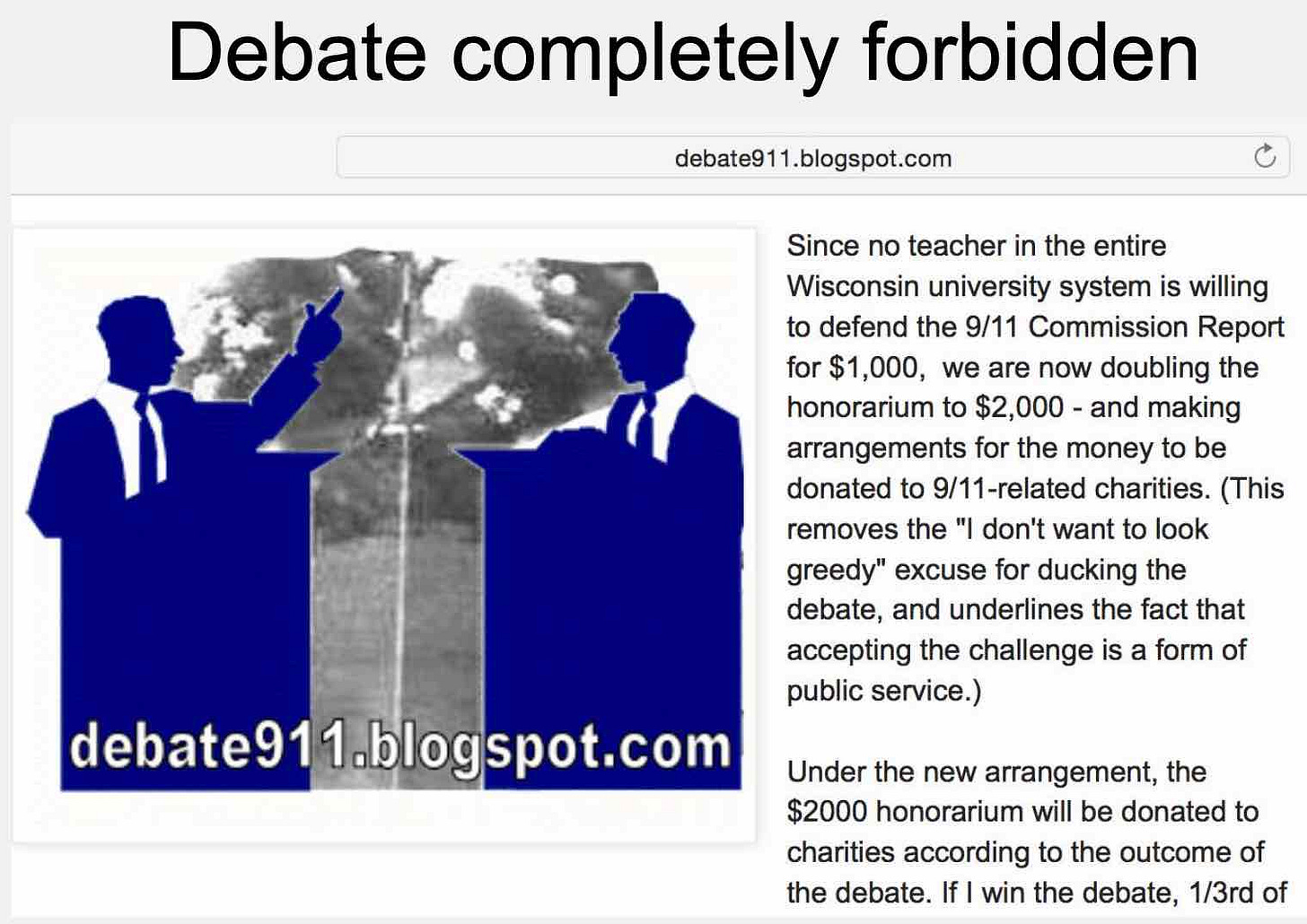 It's not just that you can't talk about it and you might lose your career, might lose your job, and might lose your life, but you can't even debate it. Nobody's allowed even to SUPPORT the official story in a debate. At the University of Wisconsin, I put up a challenge: My backers offered a 1,000-dollar honorarium for anybody who would try to support the official story in a debate with me.