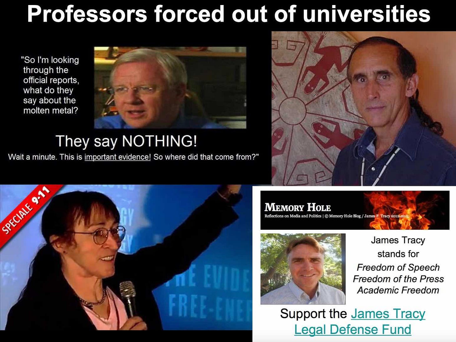 And then we just had James Tracy, another pro-9/11-truth professor, forced out of Florida Atlantic University for his discussions of what may or may not have taken place at Sandy Hook. So, again, it's not necessarily all that safe to talk about this stuff, even if you're tenured. Steve Jones and James Tracy and Four Arrows were all tenured. Three out of four of these people were tenured, and they've still been fired for going after the truth on these crimes.