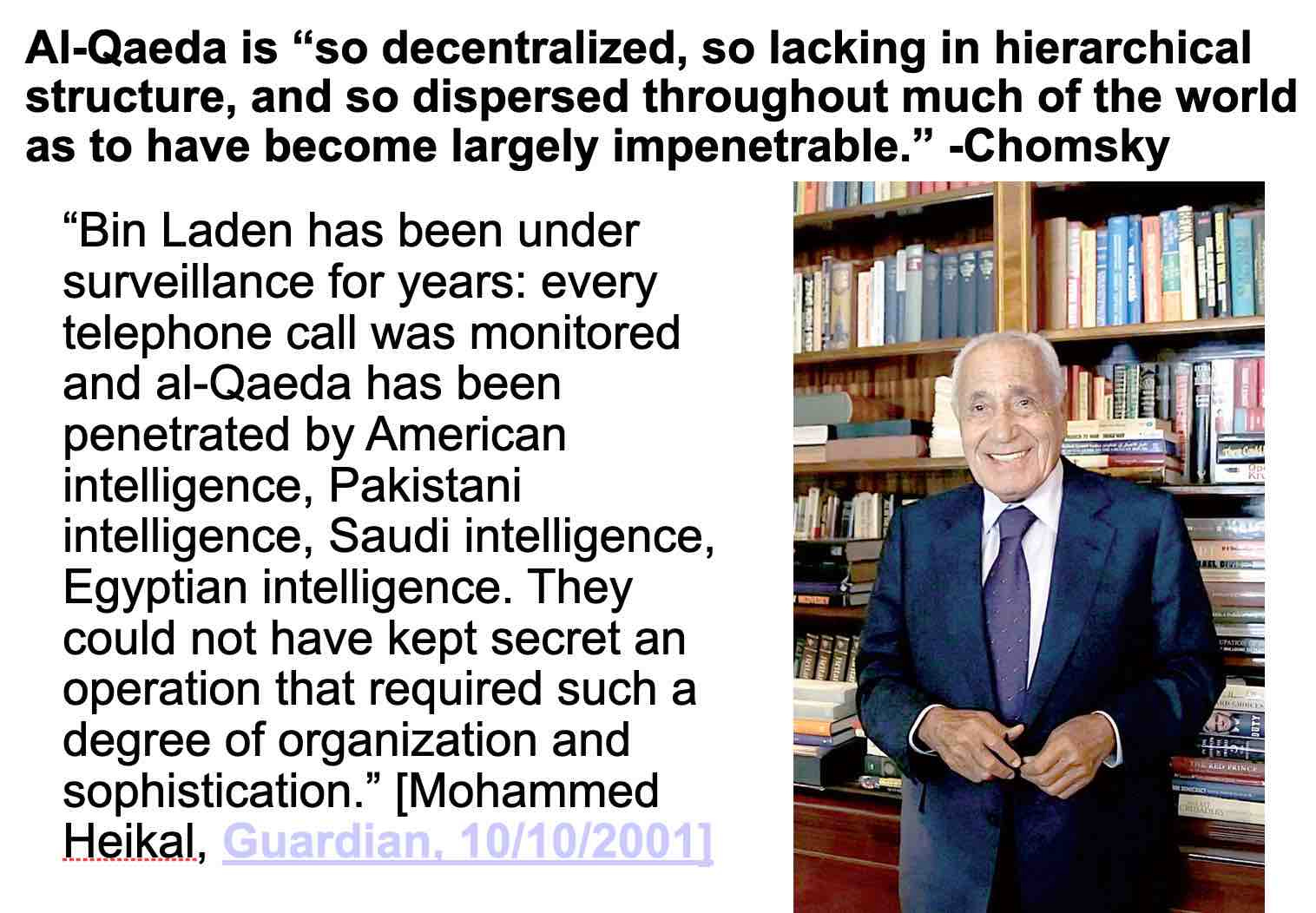 Chomsky—and this is another quote from his book 9/11—tells us that Al Qaida is so decentralized and so lacking in a hierarchical structure and so dispersed through much of the world as to be “largely impenetrable.”