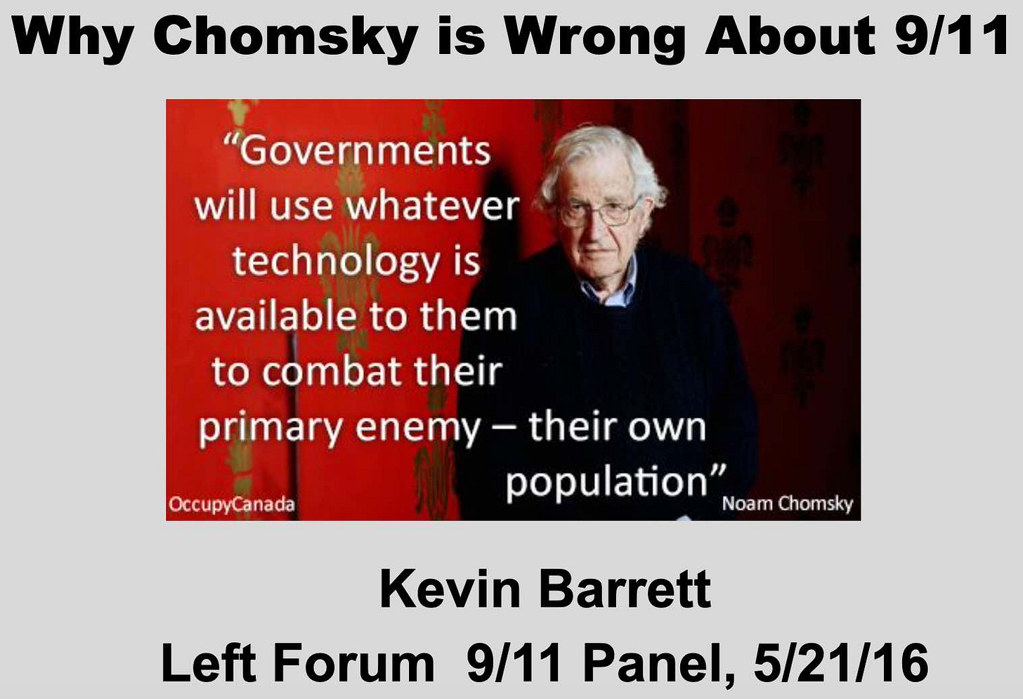 Kevin Barrett: Thank you. My title is Why Chomsky is Wrong about 9/11. If I tried to cover that in full detail, we'd be here all night. So this is going to be the short version. But let's see, we have the first slide here: He's not wrong about everything. And we'll touch on the points where where he is right. And ultimately, we'll go through a lot of areas where he doesn't even really rise to the level of being wrong, because he's not saying anything coherent. I will try to find what he does say that's coherent and make some sense of it.
