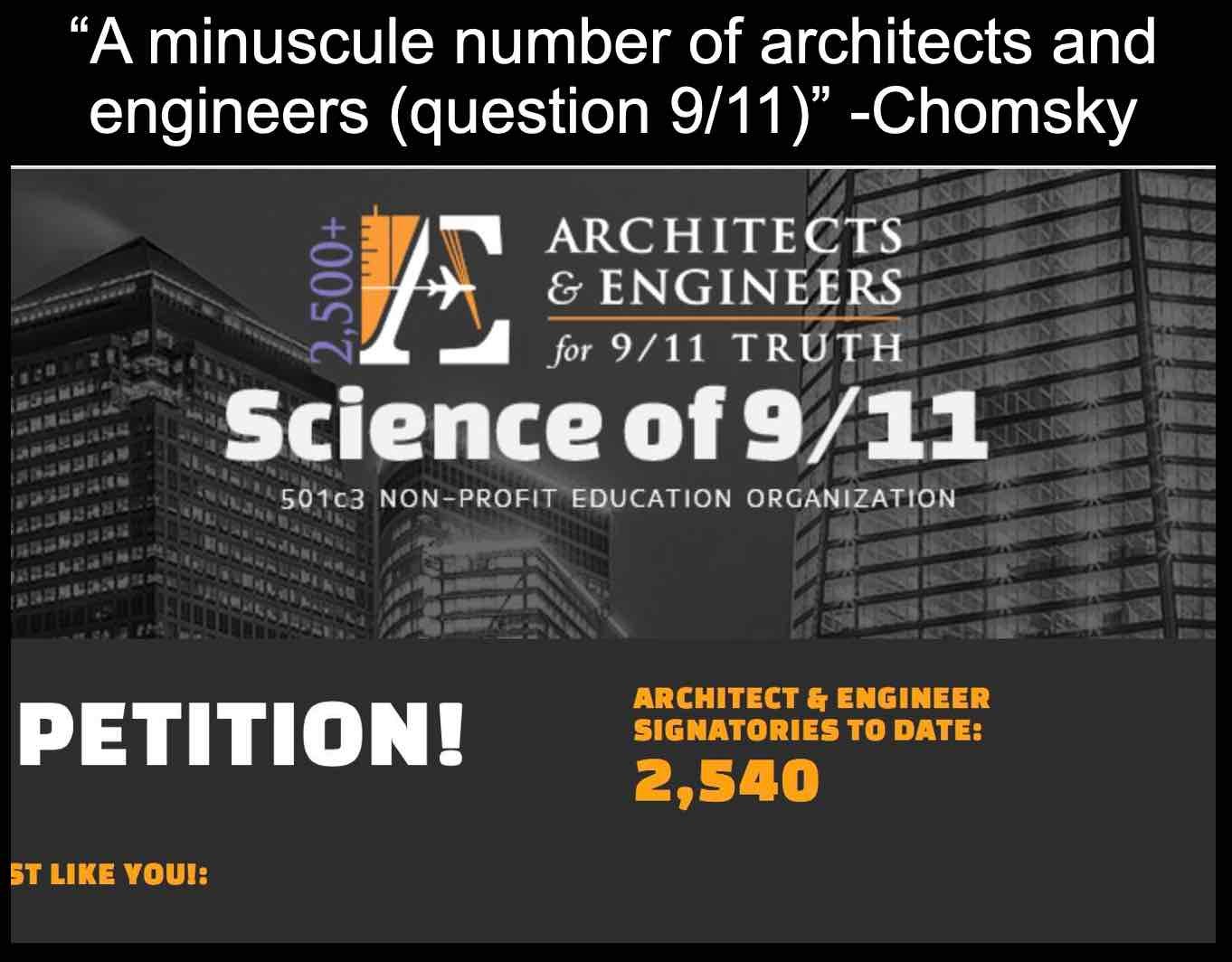 But gradually, the architects and engineers caught up with people like me, humanities PhDs, and realized that this is completely ludicrous. It's a third grade science problem to see that none of this is even remotely physically possible. So here's Chomsky telling us that a "minuscule number," which is now up to 2500, question 9/11. Okay, glad to hear that.